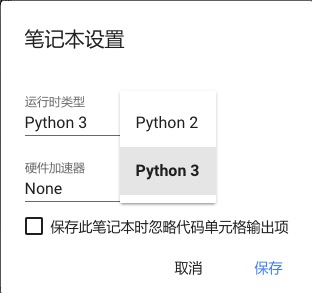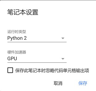 确认运行时类型为Python 2,硬件加速器为GPU。如果不是这样的设置,请修改。然后点击保存。