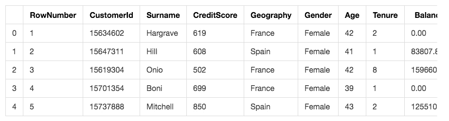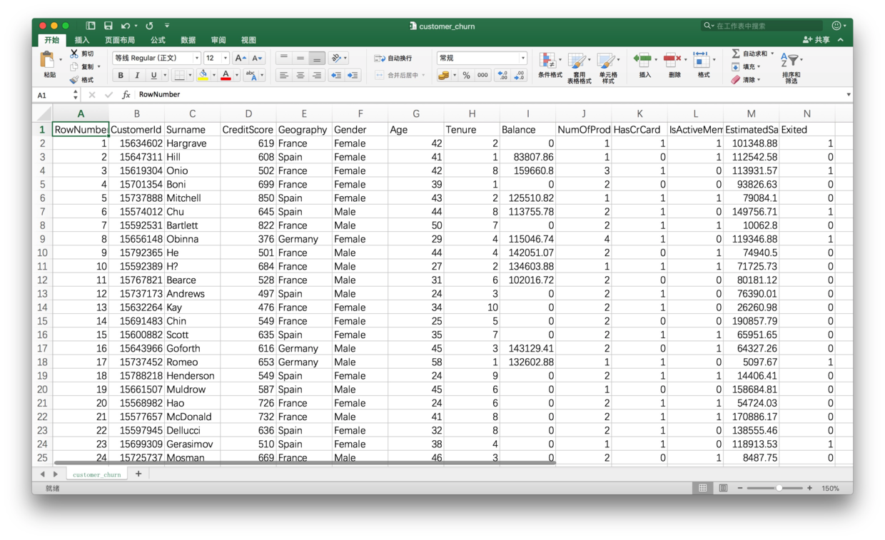 你手里掌握的信息,包括他们的年龄、性别、信用、办卡信息等。客户是否已流失的信息在最后一列(Exited)。