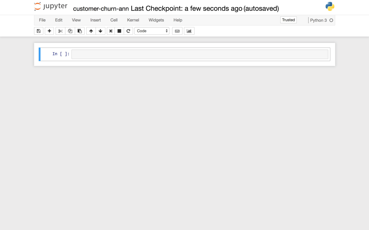 点击界面右上方的New按钮,新建一个Python 3 Notebook,起名为customer-churn-ann。