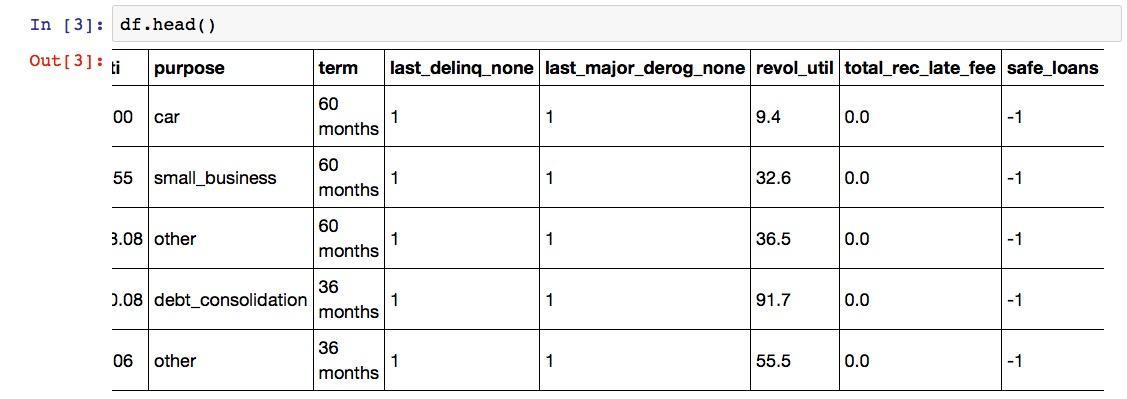 你应该还记得吧,每一条数据的最后一列safe_loans是个标记,告诉我们之前发放的这笔贷款是否安全。我们把这种标记叫做目标(target),把前面的所有列叫做“特征”(features)。这些术语你现在记不住没关系,因为以后会反复遇到。自然就会强化记忆。