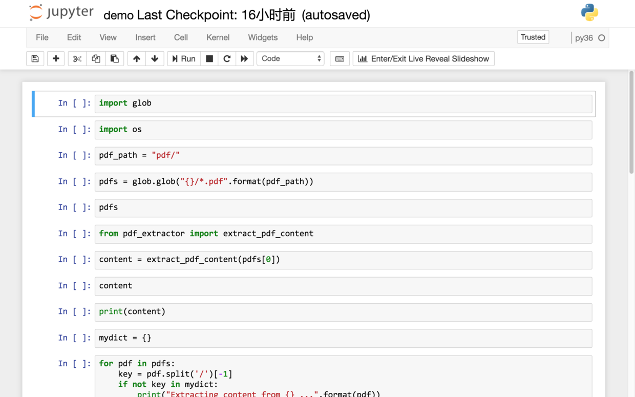 我们遍历 pdfs 列表,把文件名称(不包含目录)作为键值。这样,我们可以很容易看到,哪些pdf文件已经被抽取过了,哪些还没有抽取。