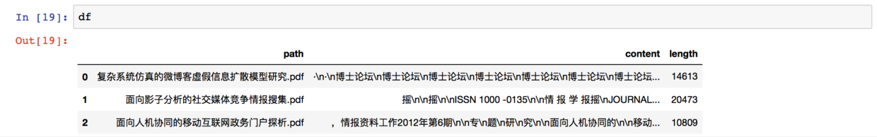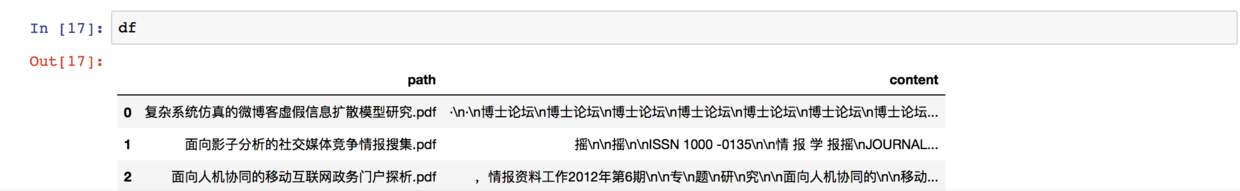 可以看到,我们的数据框拥有了pdf文件信息和全部文本内容。这样你就可以使用关键词抽取、情感分析、相似度计算等等诸多分析工具了。