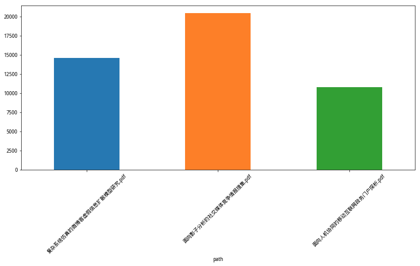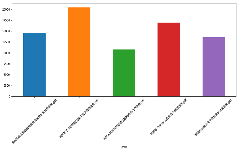 下面,我们让 Pandas 把字符长度一列的信息用柱状图标示出来。为了显示的美观,我们设置了图片的长宽比例,并且把对应的pdf文件名称以倾斜45度来展示。