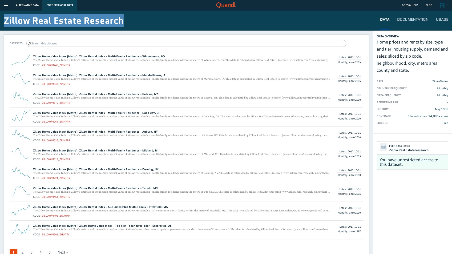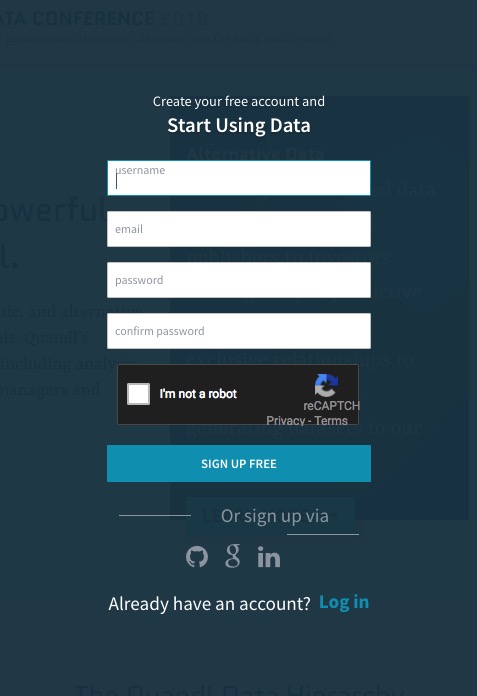 你需要在Quandl免费注册一个账户,这样才可以正常访问其免费数据集合。