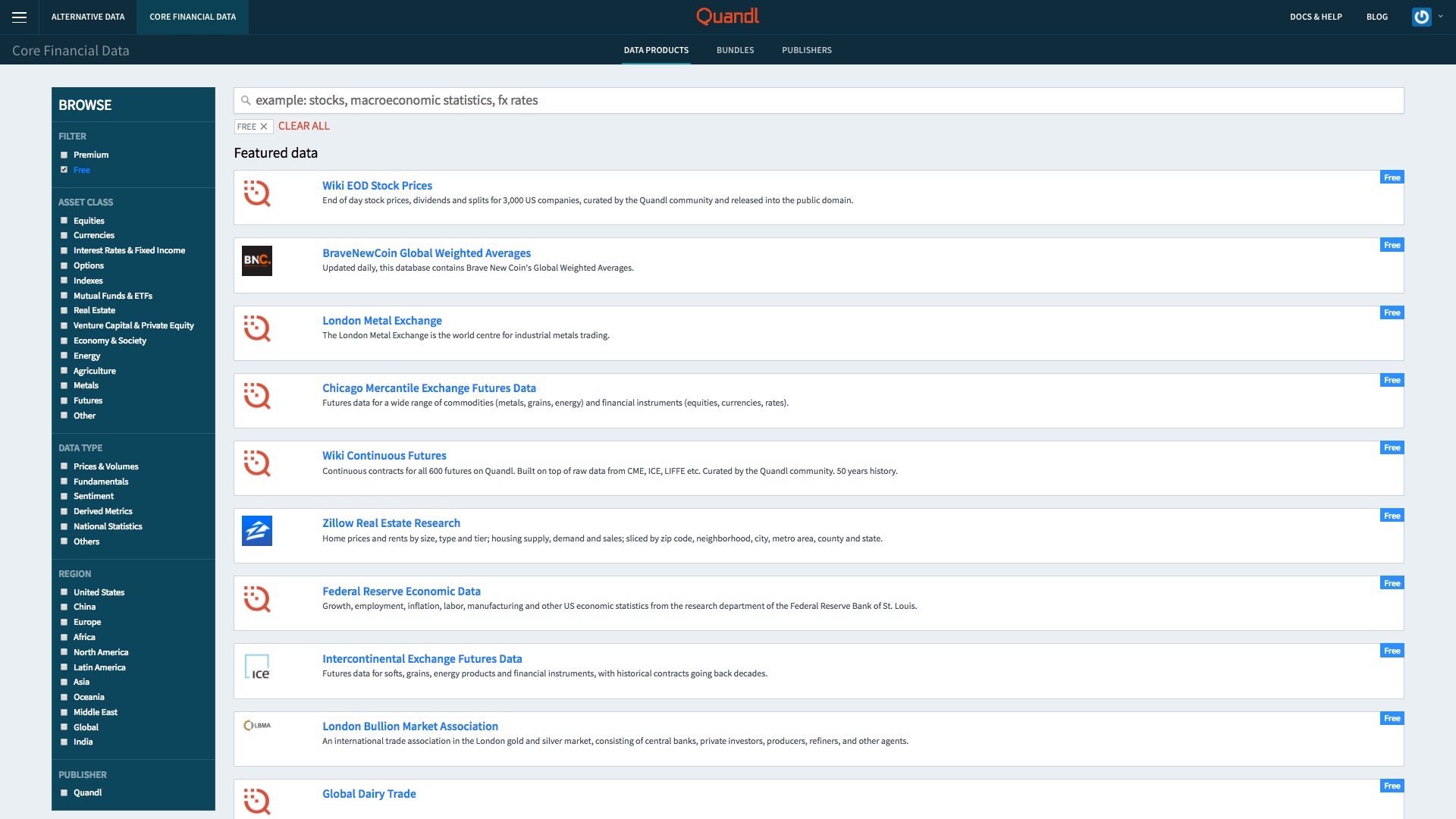 Quandl是一个金融和经济数据平台。其中既包括价格不菲的收费数据,也有不少免费开放数据。