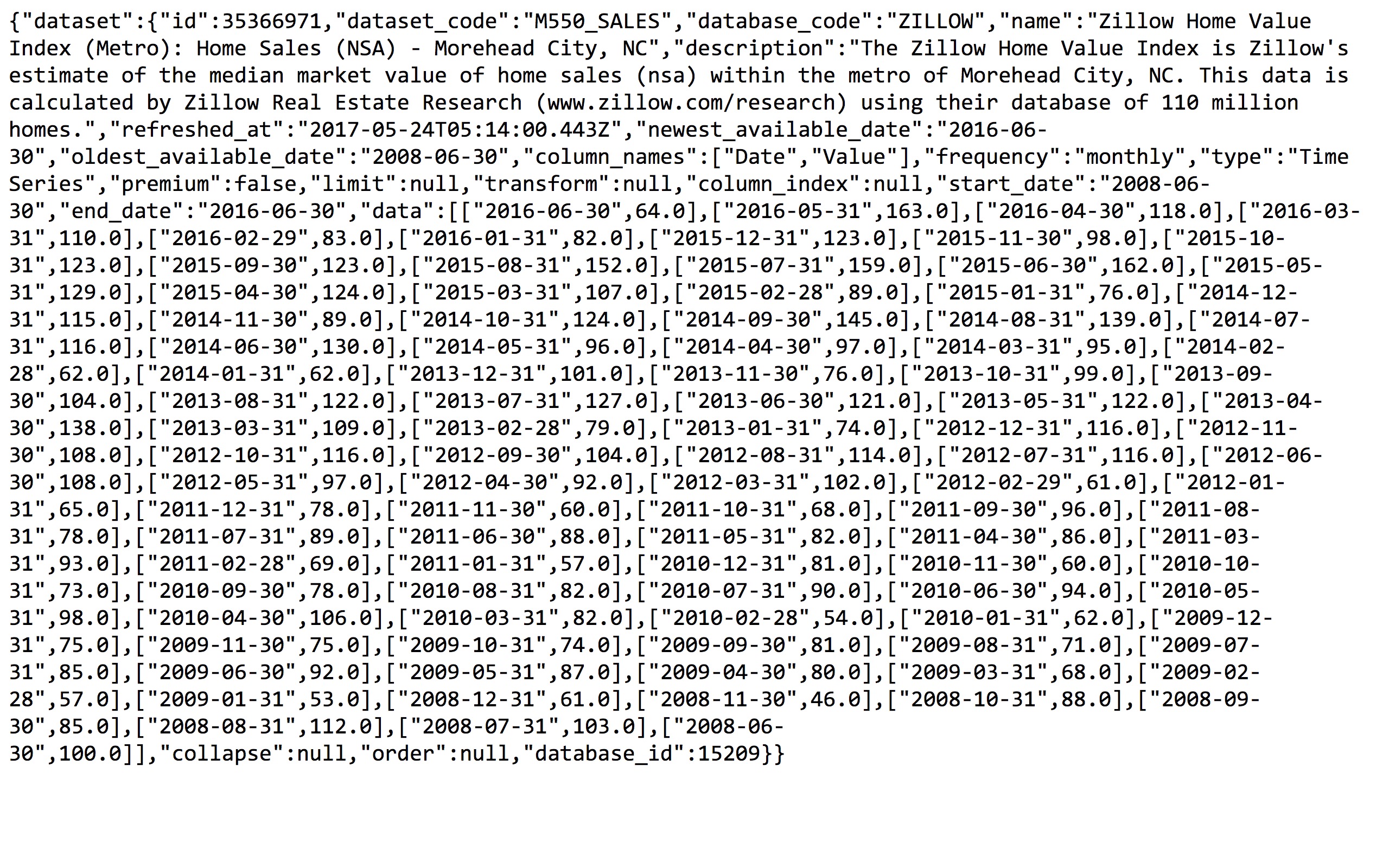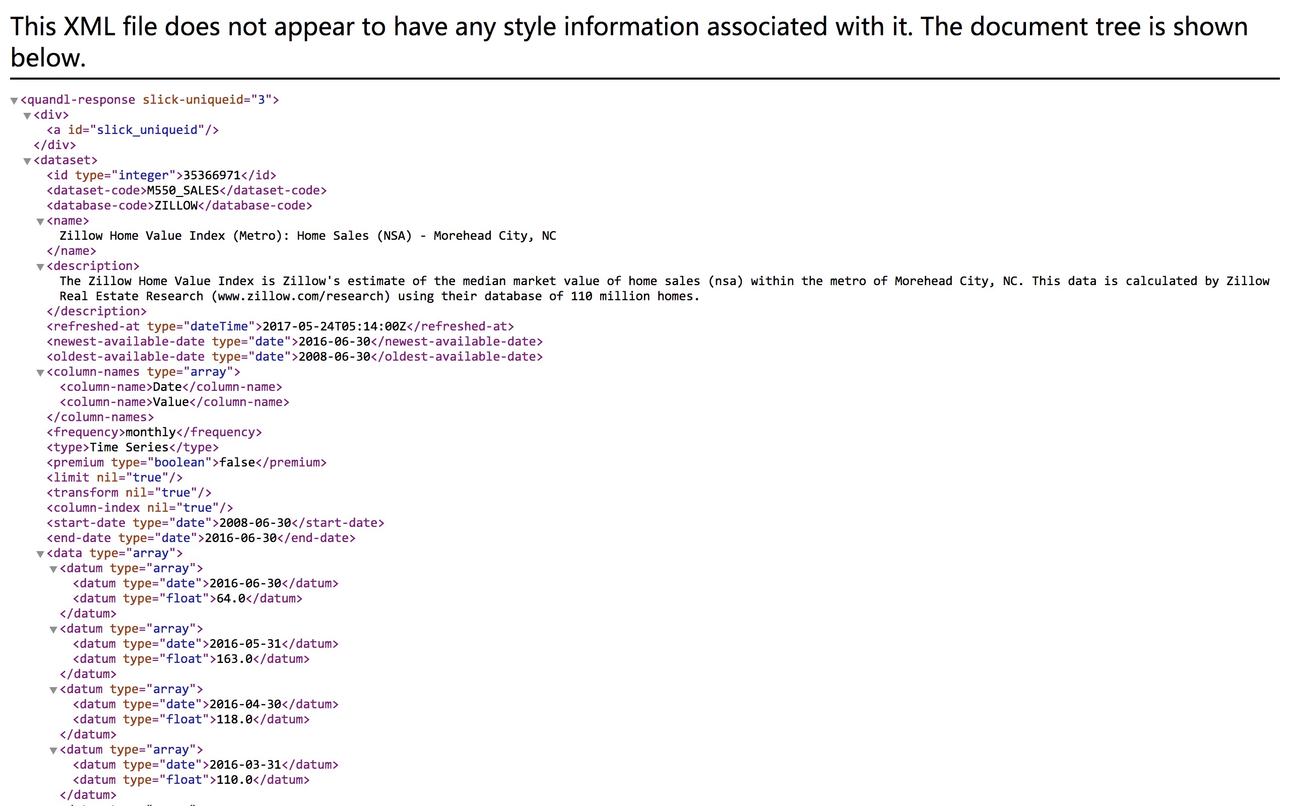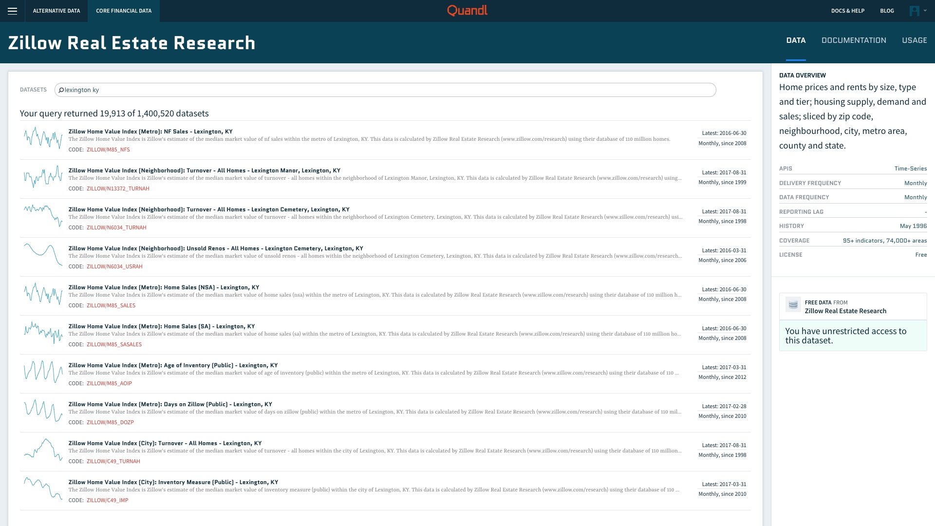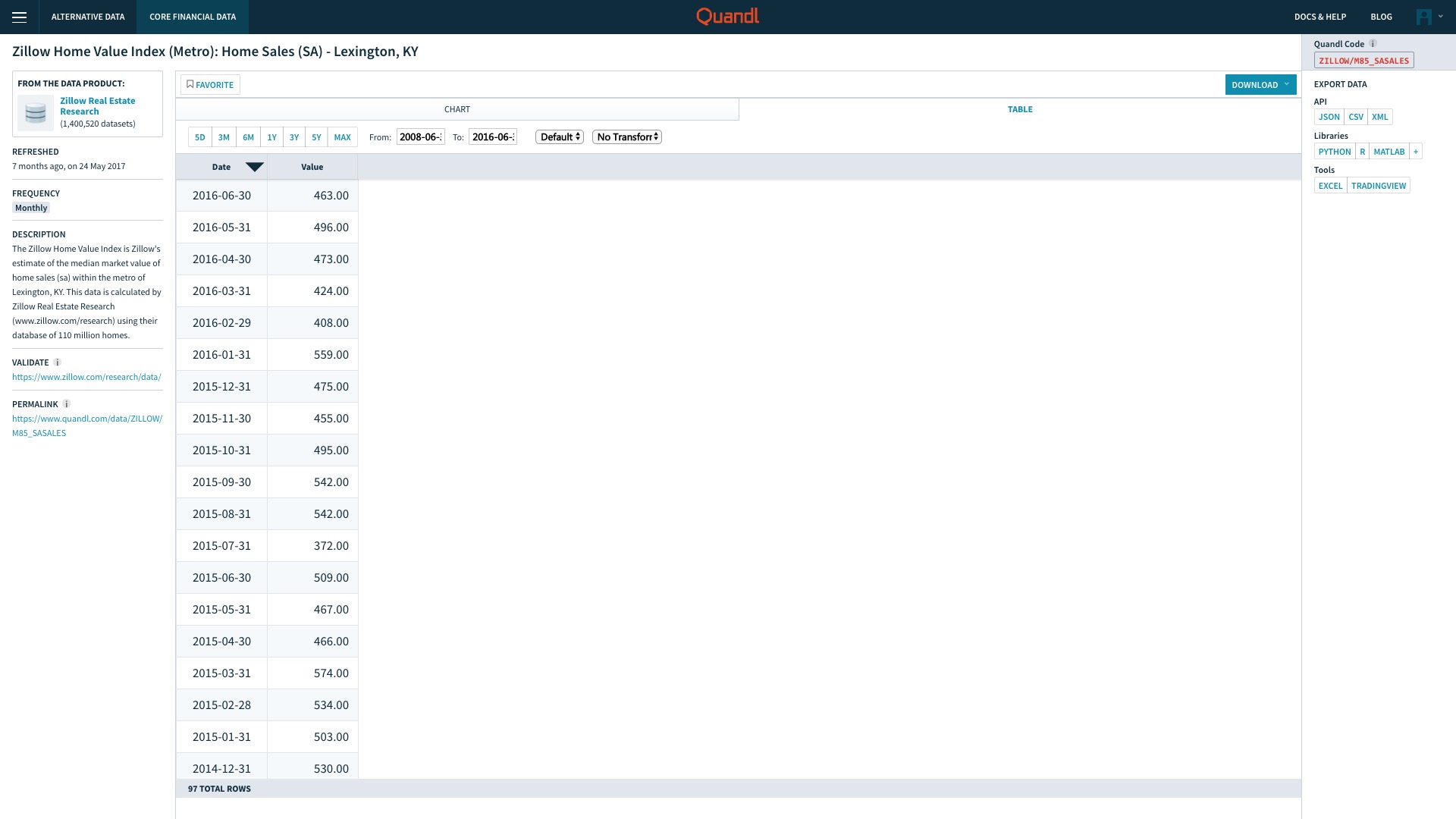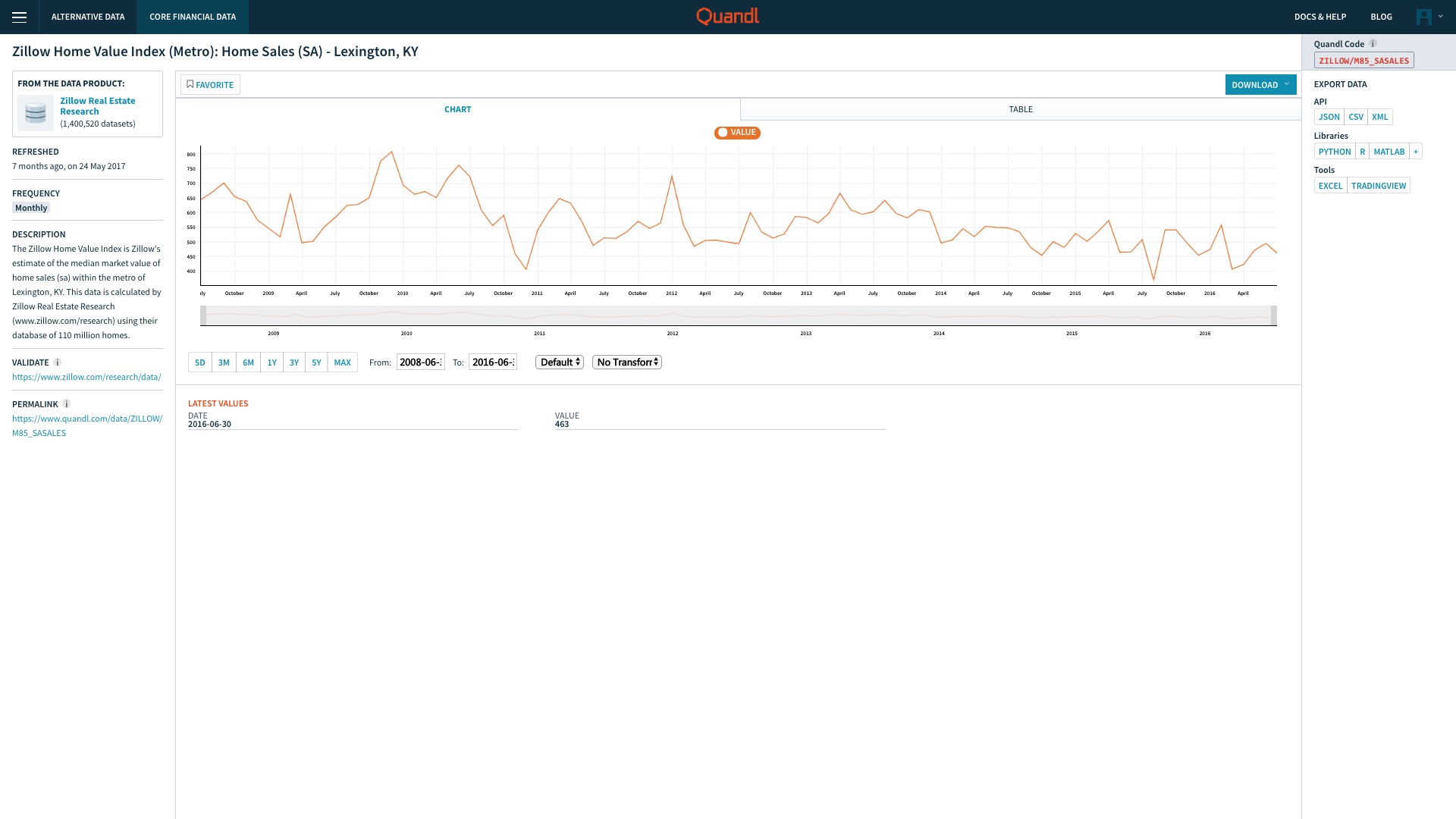 我们选择其中的“Zillow Home Value Index (Metro): Home Sales (SA) - Lexington, KY”,点击后可以看到这个数据集的页面。