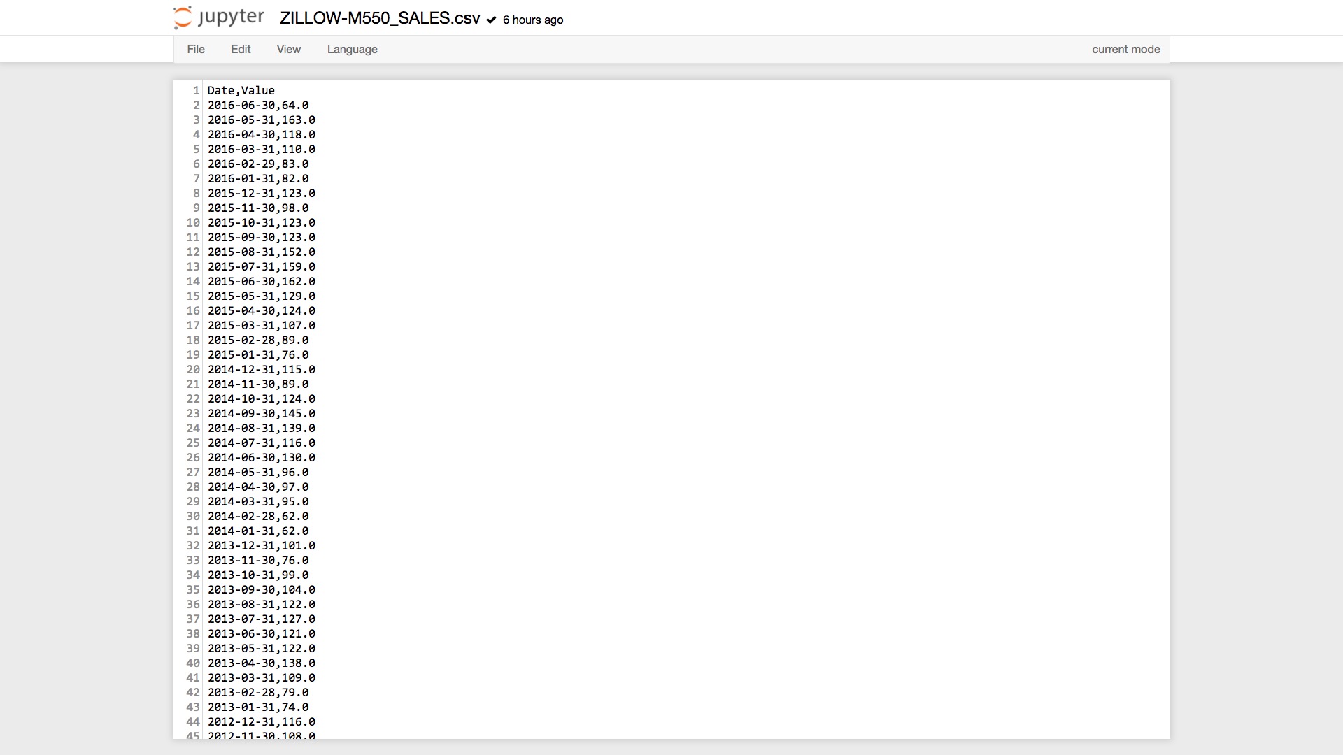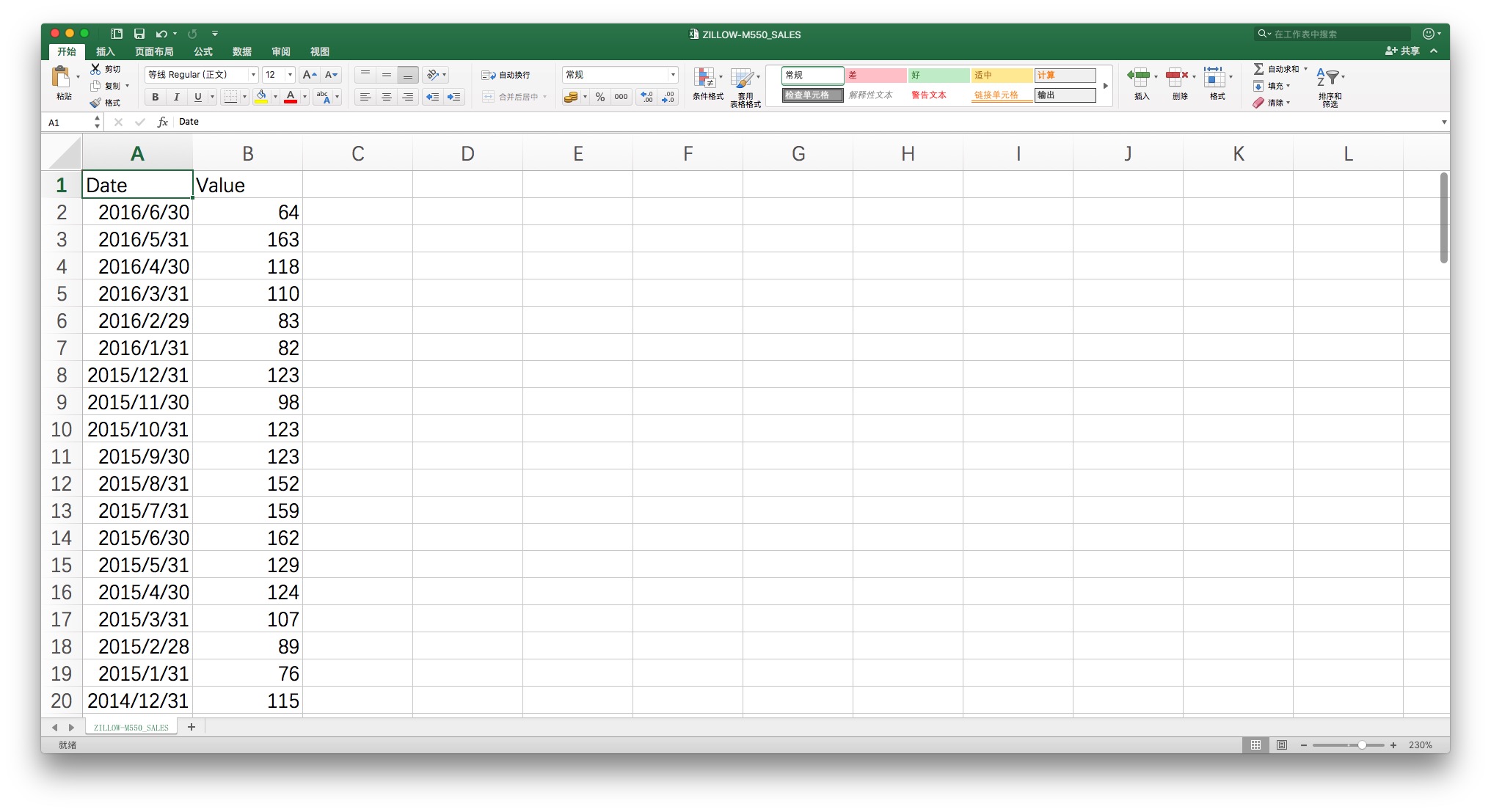 打开咱们的样例csv文件,ZILLOW-M550_SALES.csv 来看看。