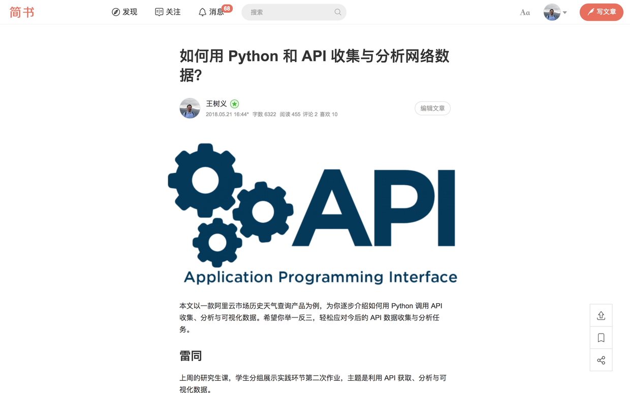 咱们以《如何用 Python 和 API 收集与分析网络数据?》(9.3)这篇文章为例。