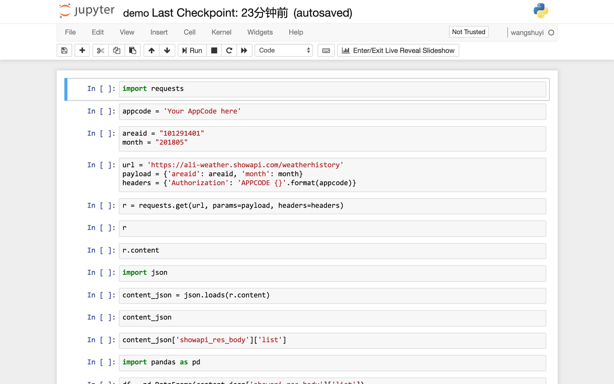 替换之后,点击菜单栏中的“Cell”,选择“Run All”,看能否正常运行全部代码,并且显示分析结果图形。