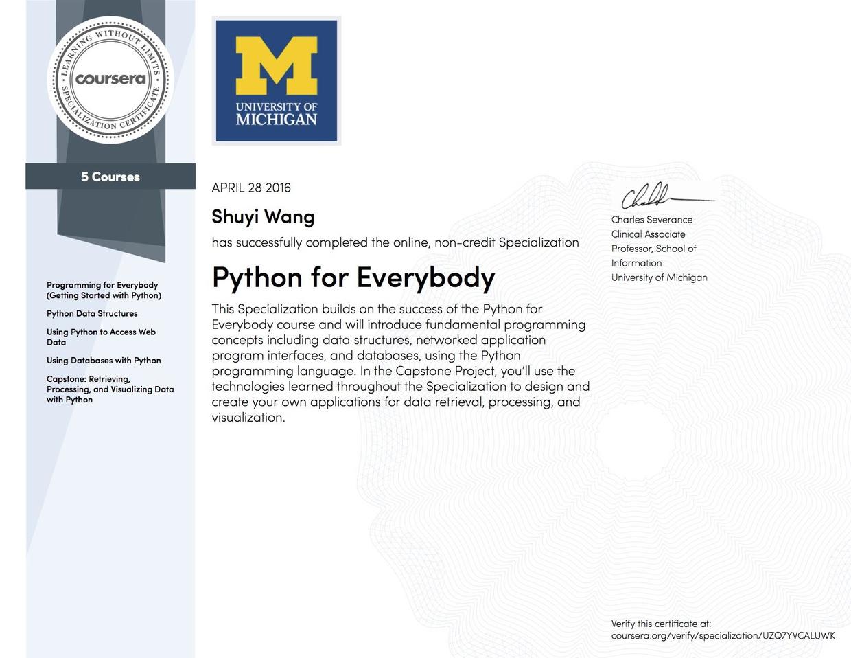Charles深谙课程迭代的技艺。他不断添加内容,完善课程体系,将一门课发展成一个专项课程(Signature Track),并且将教材升级为 “Python for Everybody: Exploring Data In Python 3”
