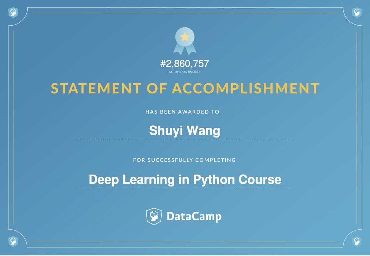 这是我在Datacamp拿到的深度学习框架Keras课程证书。确实只需要几个小时的时间就能学完。成就感还是蛮强的。