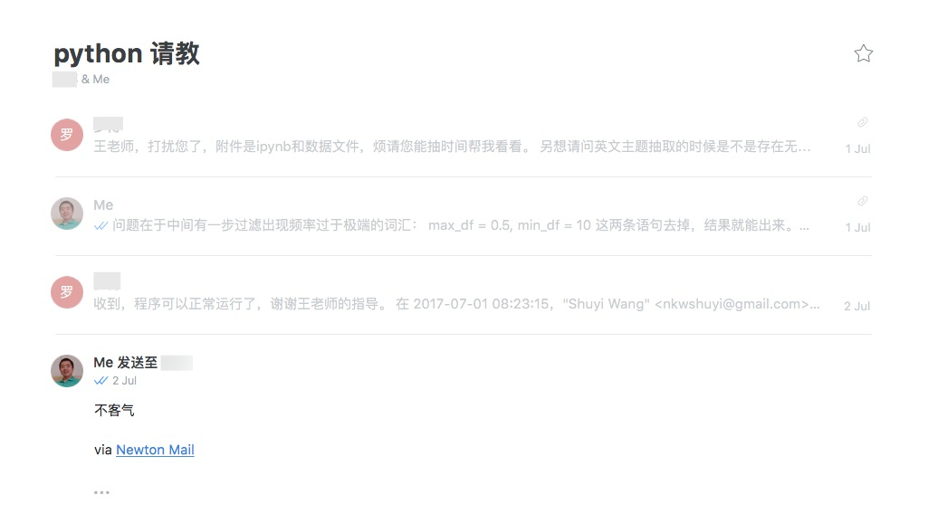 对于这一类的反馈,我秉持着“能帮就帮”的原则。一两句话能够说明的问题,我就旋即答复;对于那些需要深入调查的问题,我会让读者把Jupyter Notebook或者R notebook文件以及数据发给我。这里真得感谢文学化编程环境的提供者们,给我和读者这样便捷沟通、重现问题的方式。
