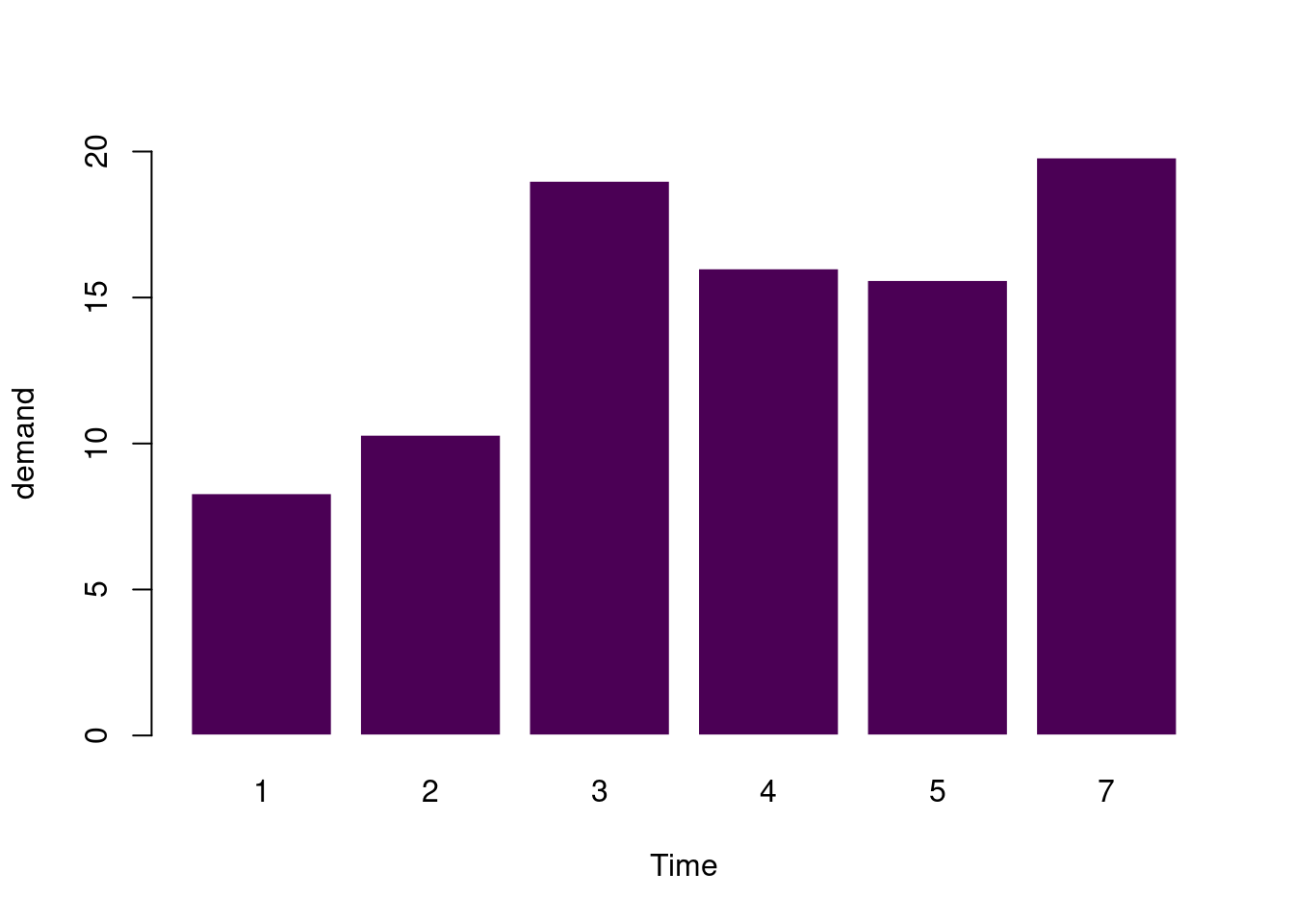 data = BOD, demand ~ Time, ylim = c(0, 20),