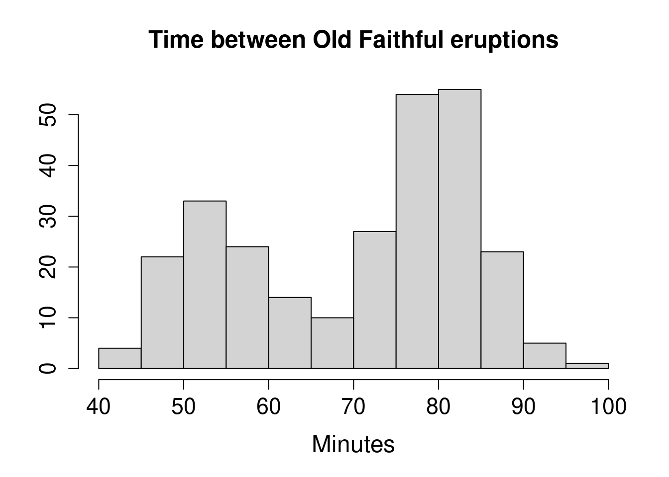图 10.43: 老忠实泉间歇性喷水的时间间隔分布