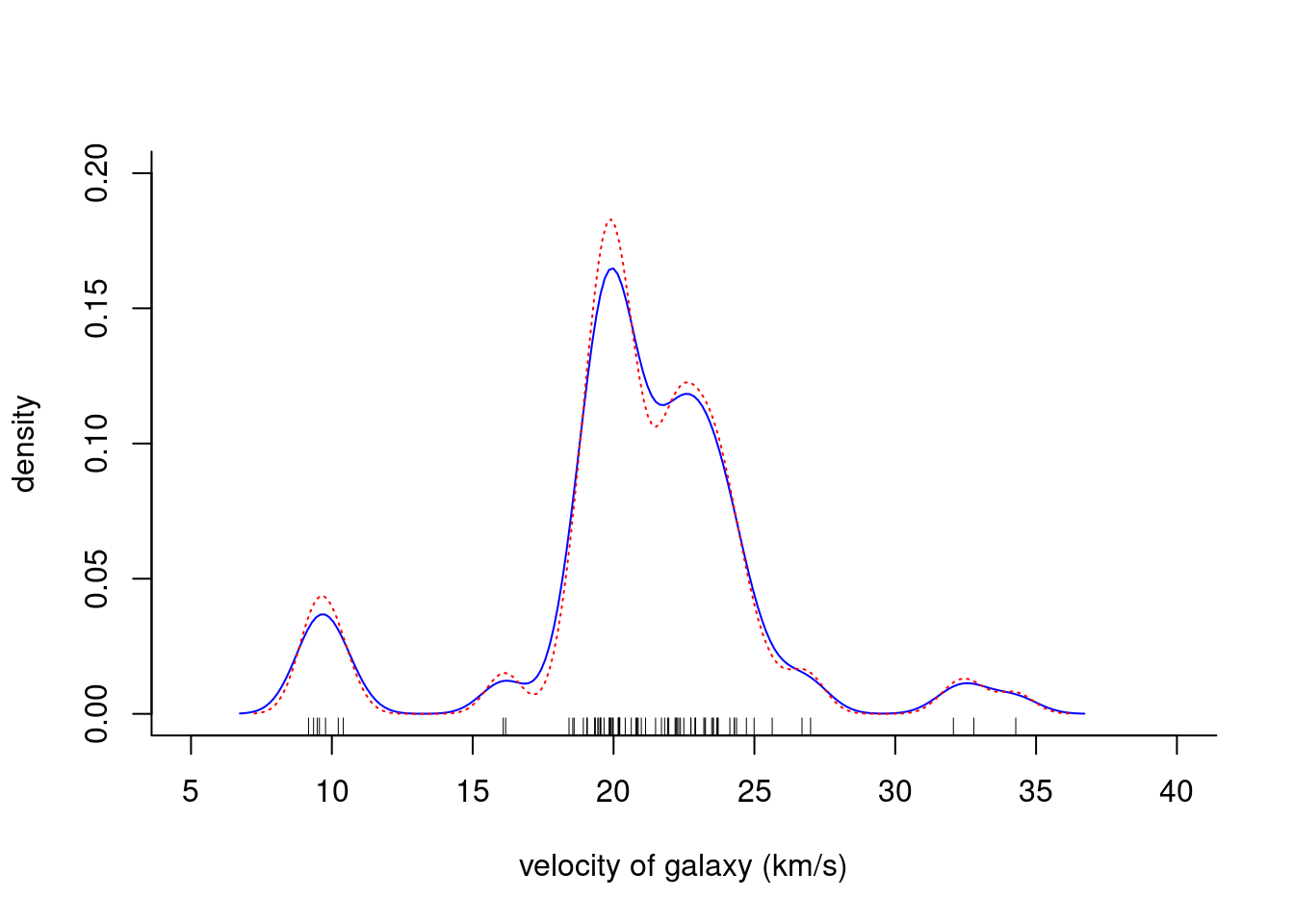 lines(density(eruptions, bw = 0.1), col = "#EA4335")