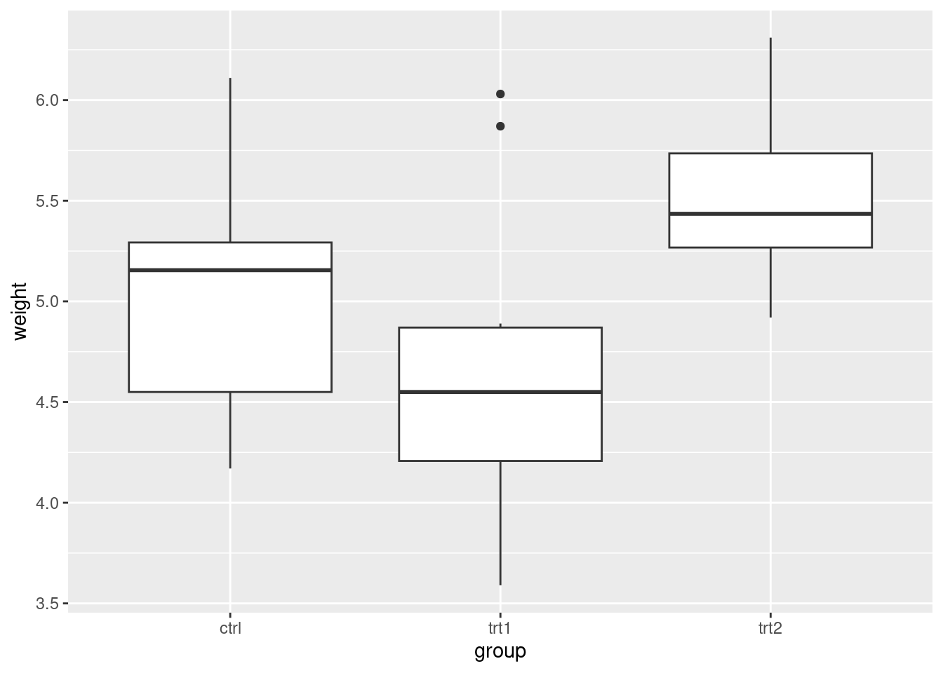 ggplot(data = PlantGrowth, aes(x = group, y = weight)) + geom_boxplot()