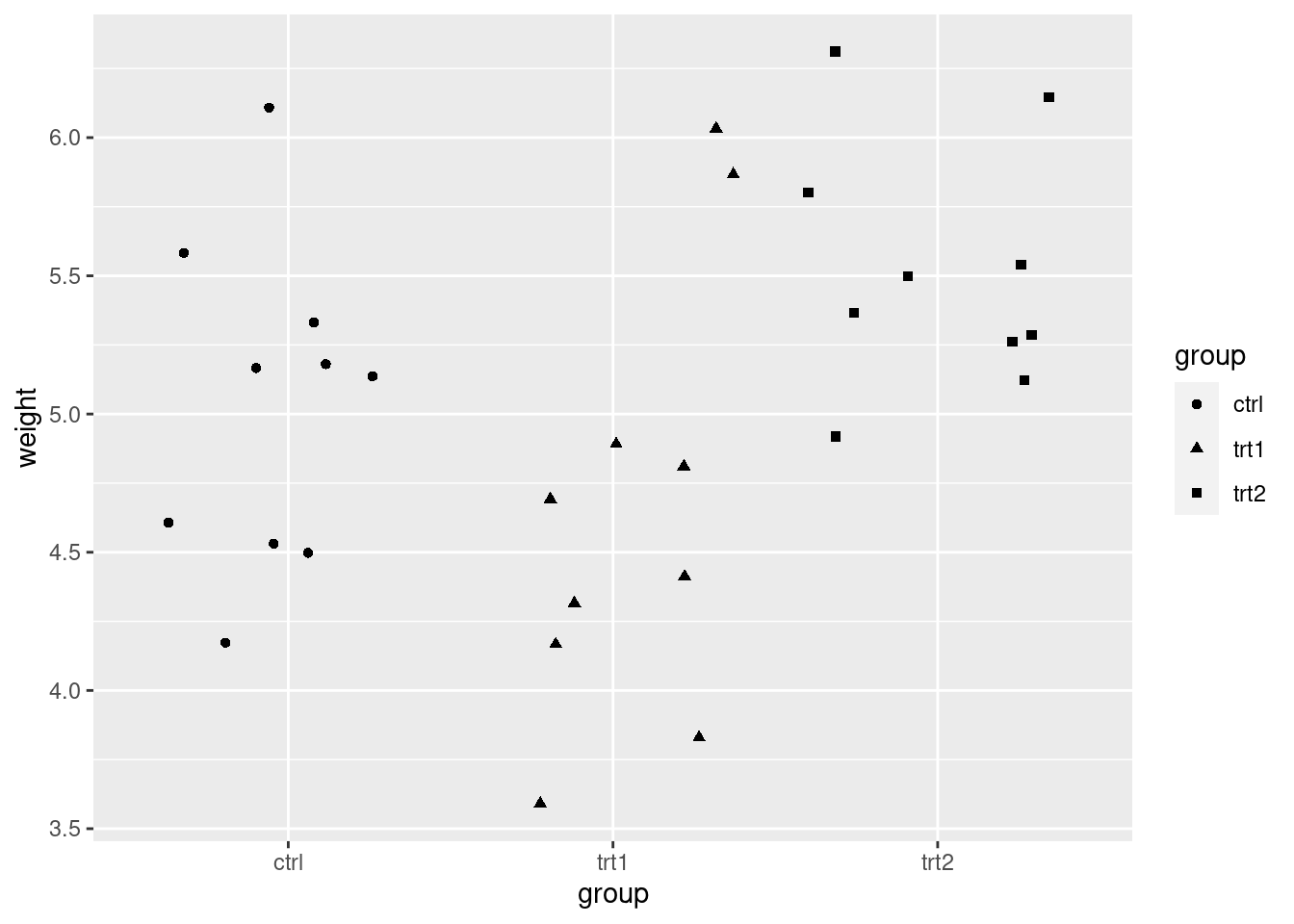 ggplot(data = PlantGrowth, aes(x = group, y = weight, shape = group)) + geom_jitter()