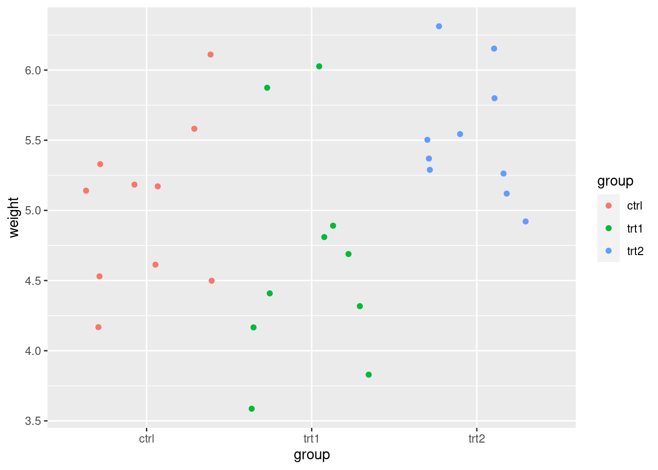 ggplot(data = PlantGrowth, aes(x = group, y = weight, color = group)) + geom_jitter()