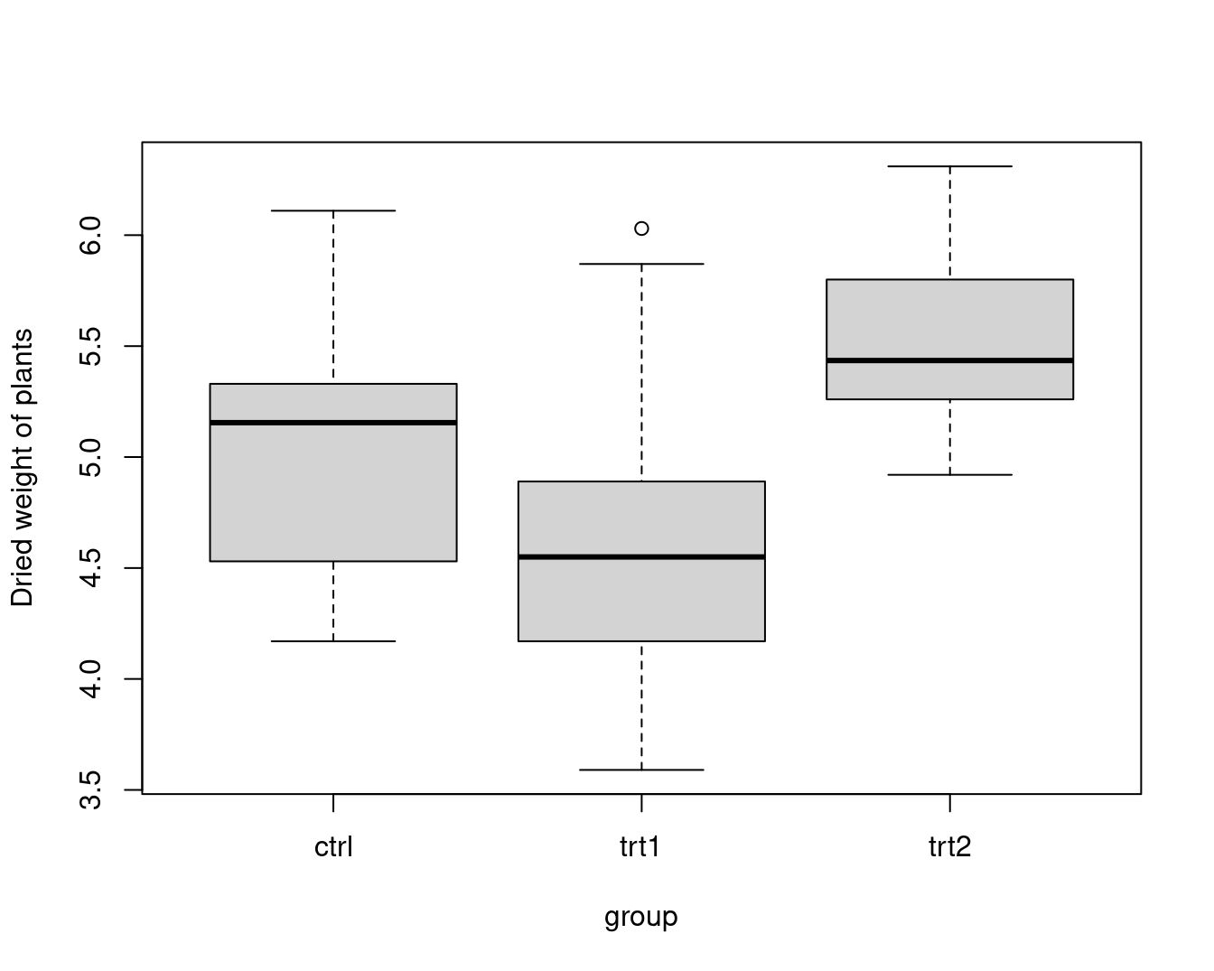 以 PlantGrowth 数据集为例展示箱线图,在两组不同实验条件下,植物生长的情况,纵坐标是干燥植物的量,横坐标表示不同的实验条件。这是非常典型的适合用箱线图来表达数据的场合,Y 轴对应数值型变量,X 轴对应分类变量,在 R 语言中,分类变量的类型是 factor