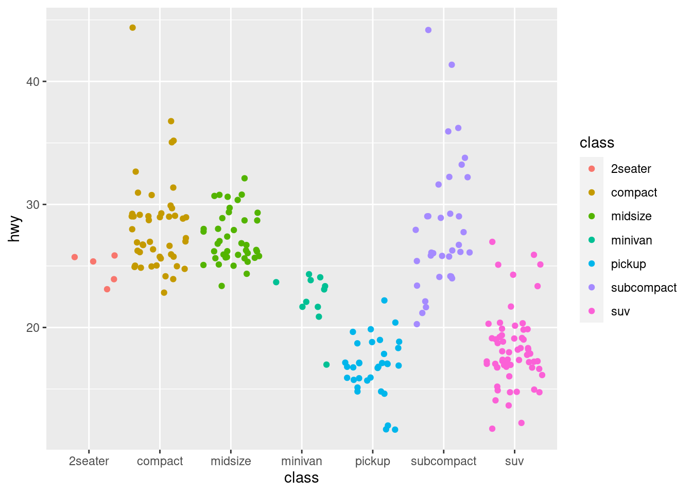 ggplot(mpg, aes(x = class, y = hwy, color = class)) + geom_jitter()