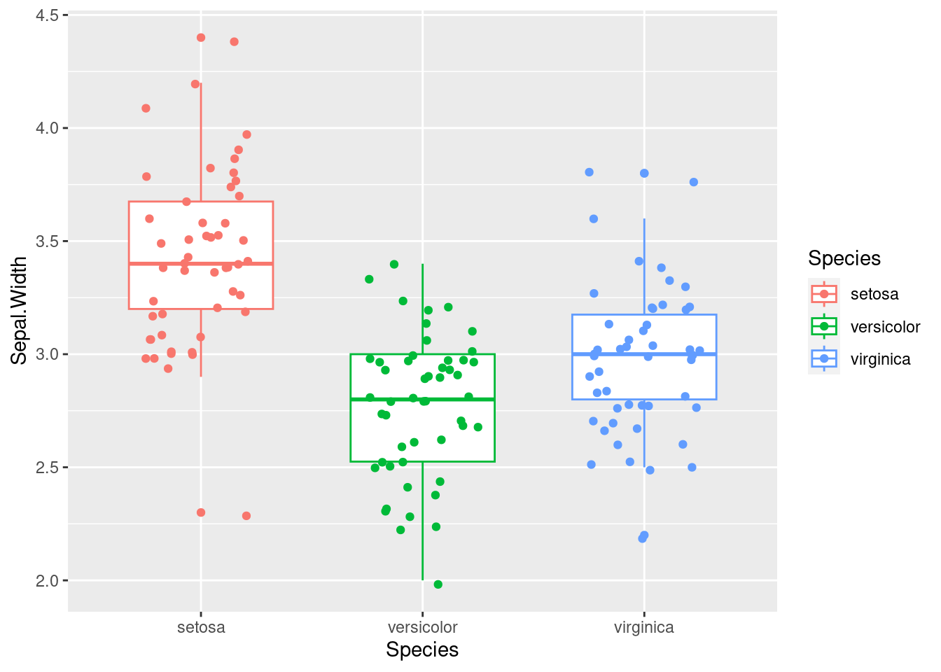 ggplot(iris, aes(x = Species, y = Sepal.Width, color = Species)) +