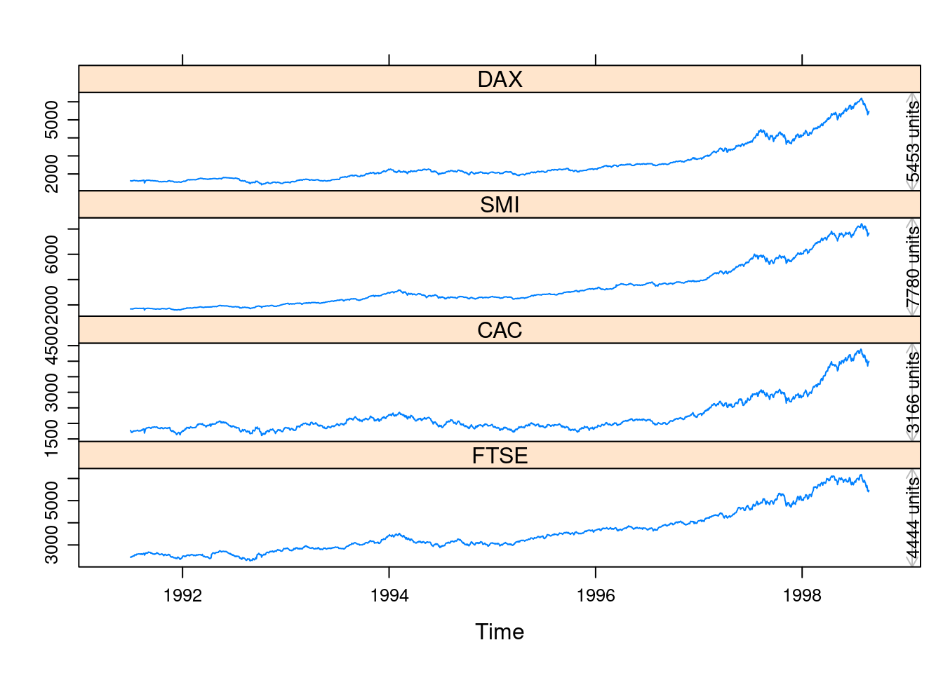 xyplot(EuStockMarkets) +