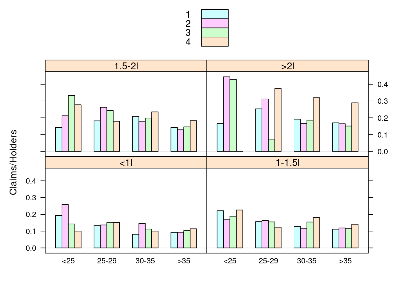 barchart(Claims / Holders * 100 ~ Age | Group,