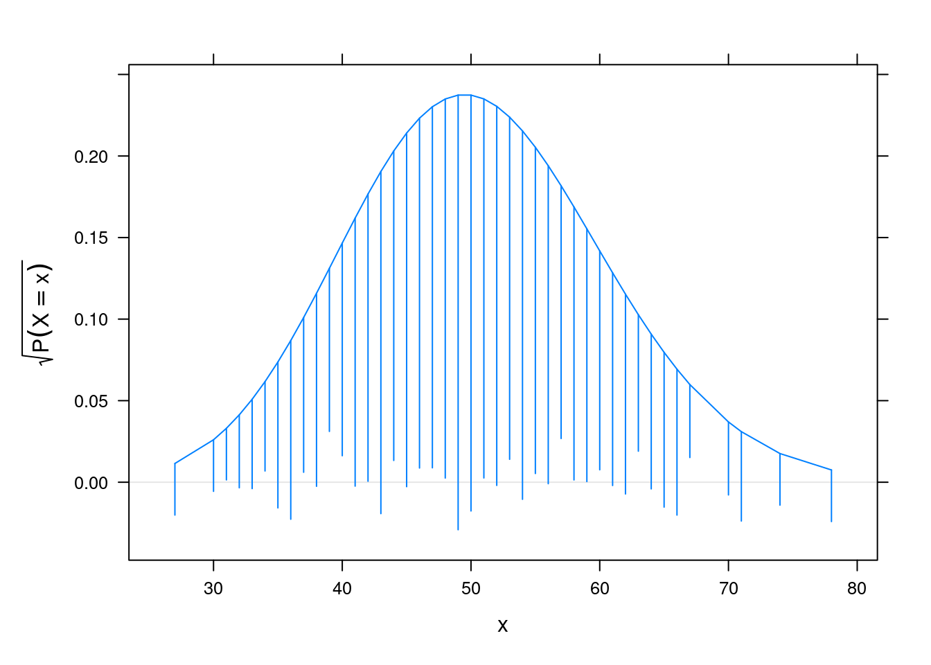 rootogram(~x, dfun = function(x) dpois(x, lambda = 50))