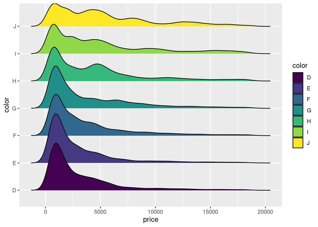ggridges::geom_density_ridges(aes(x = price, y = color, fill = color))