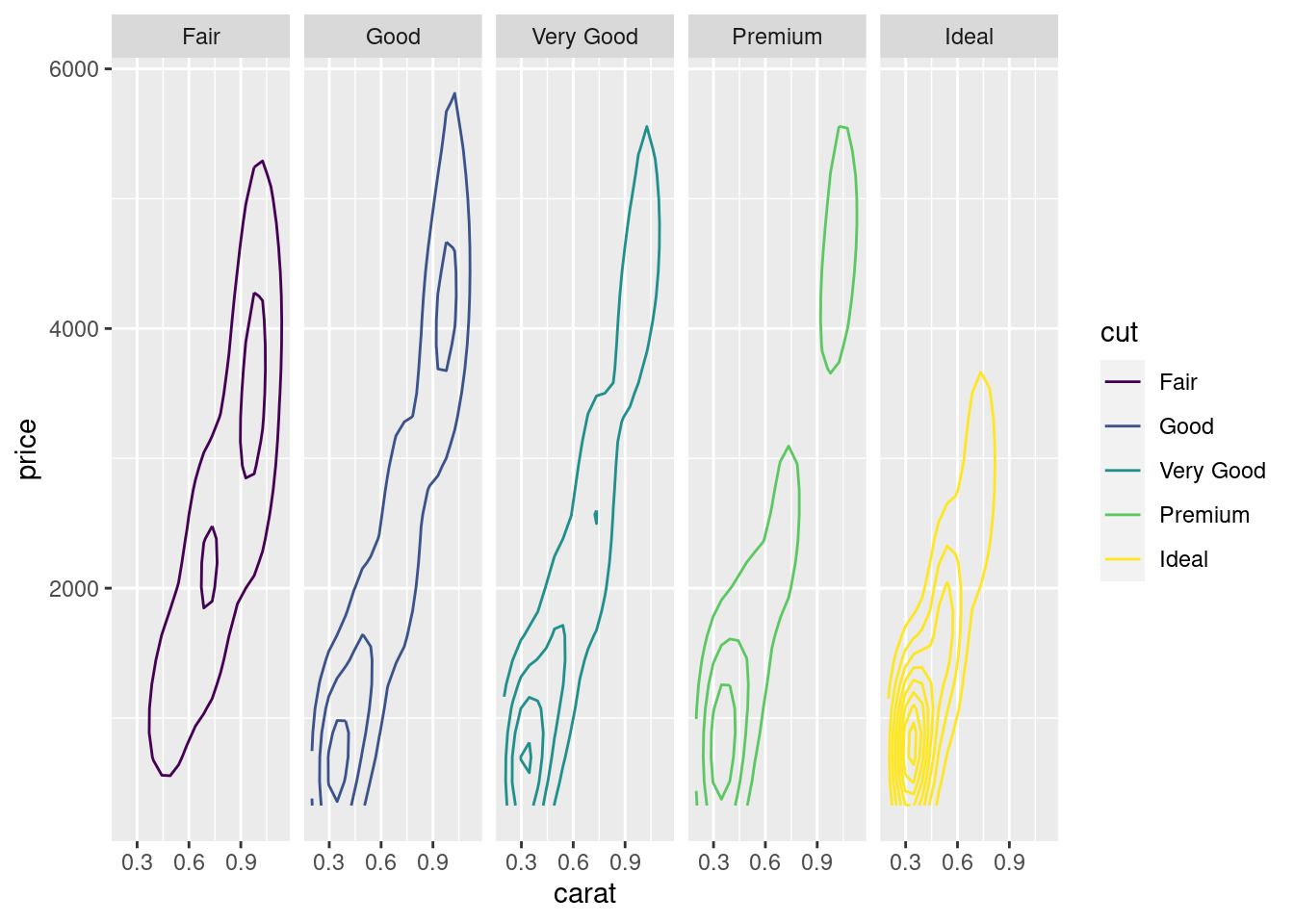 MASS::kde2d() 实现二维核密度估计,ggplot2 包提供了两种等价的绘图方式