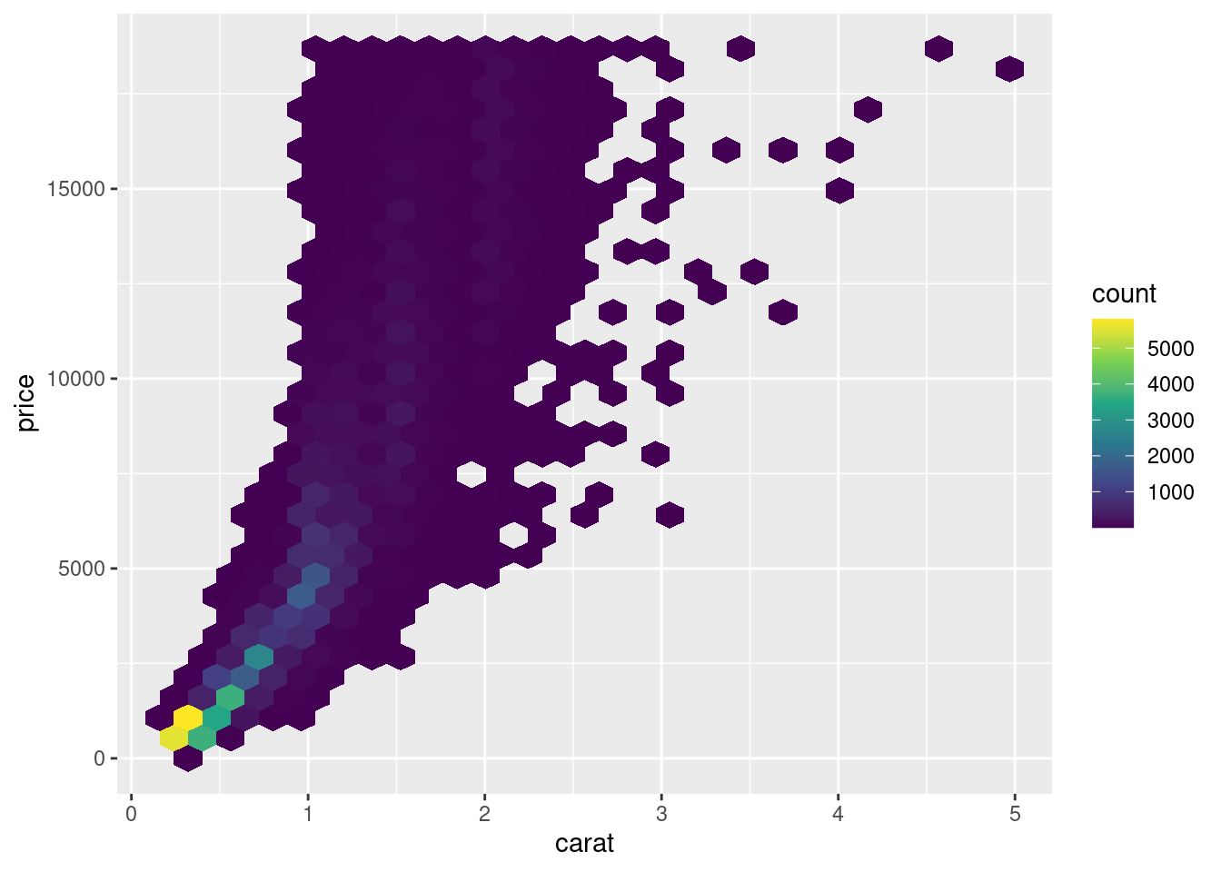 ggplot(diamonds, aes(x = carat, y = price)) + geom_hex() +