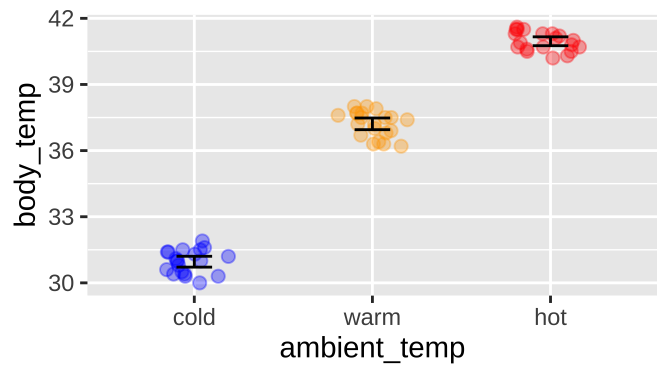Or for the extended example in this chapter, if ambient temperature can influence body temperature in rodents, like the round-tailed ground squirrel, Spermophilus tereticaudus. In this experiment, Wooden and Walsberg (2004) put squirrels in environments that where 10°C (cold), 35°C (warm), and 45°C (hot), and measured their body temperature. The data are plotted in