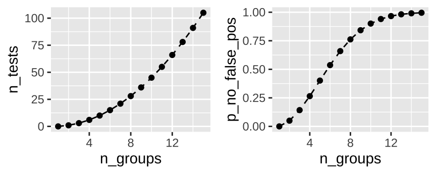 This is a potential problem when looking at differences between groups, as the number of pairwise test rapidly expand with the number of groups. How rapidly, you ask? Let’s revisit the binomial equation, where \(k\) is 2 (because we make pairs of two) and we have \(n\) groups.