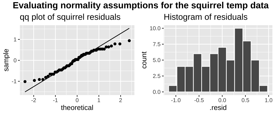 draw_label("Evaluating normality assumptions for the squirrel temp data", fontface = 'bold',x = 0,hjust = 0) +