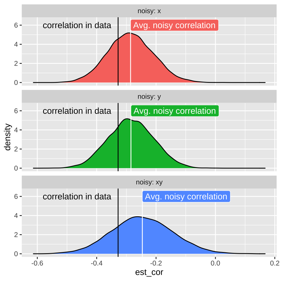 And compare our estimated correlation in these noisier estimates to our initial estimate of the correlation. To do so, let’s first copy our initial data set a bunch on times with the rep_sample_n() function in the infer package. In both cases lets add a standard deviation’s random noise