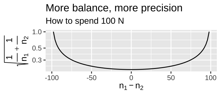 - Balanced design Balance refers to the similarity in sample sizes for each treatment. Recall that \(SE_{\overline{Y_1}-\overline{Y}_2} = \sqrt{s_p^2(\frac{1}{n_1}+\frac{1}{n_2})}\). So, for a fixed total sample size, more balanced experiments decrease uncertainty mean differences between treatments.