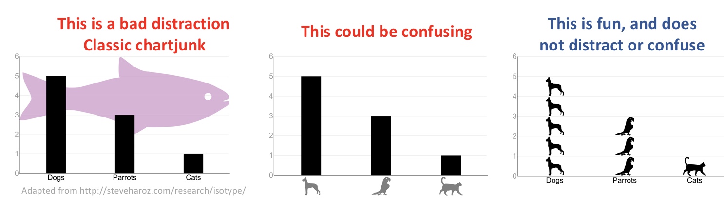 After experimented with unconventional clothing, the designer and architect Buckminster Fuller decided to become “the invisible man” by dressing in clothes that would not draw attention to himself. He realized that he wanted people to pay attention to his ideas, not his look. This principle, which underlies the name of my favorite podcast on desig, 99% Invisible, holds for making figures. A good figure calls attention to patterns in the data, not to itself. Tufte (1983) railed against “chartjunk,” “data viz ducks,” needless 3D, and other features that distract from the message in the data.
