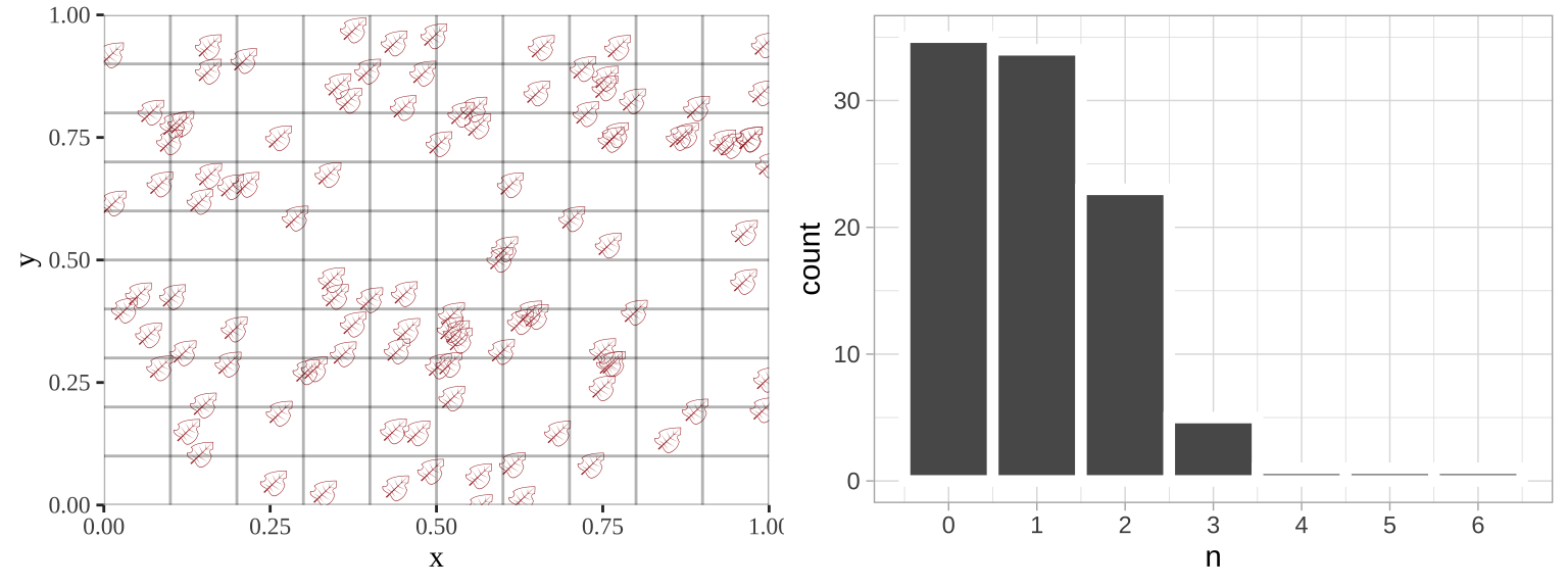 Such data are poorly described by a standard linear model, but can be modeled. Below, I simulate leaves falling randomly on a landscape. We see that the number of leaves in each quadrant does not follow a normal distribution.
