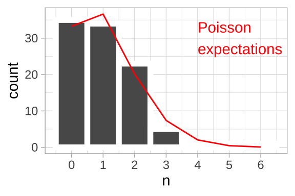 annotate(x = 4, y = 30, geom = "text", label = "Poisson\nexpectations", color = "red", hjust = 0)