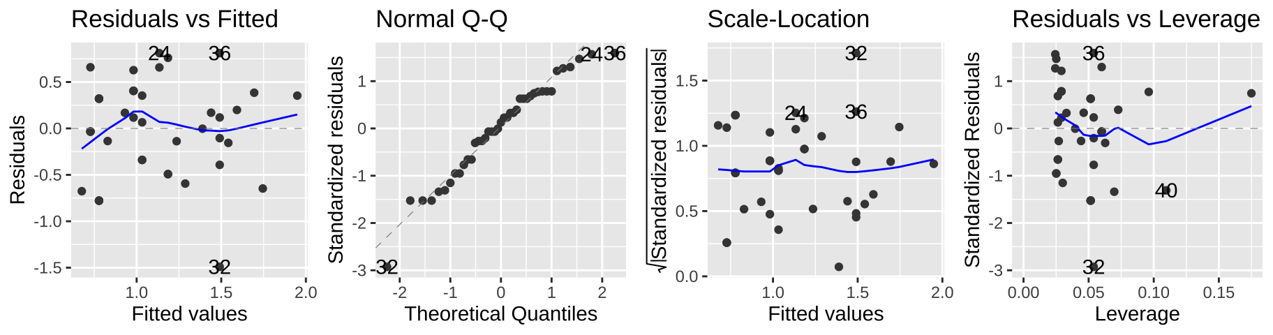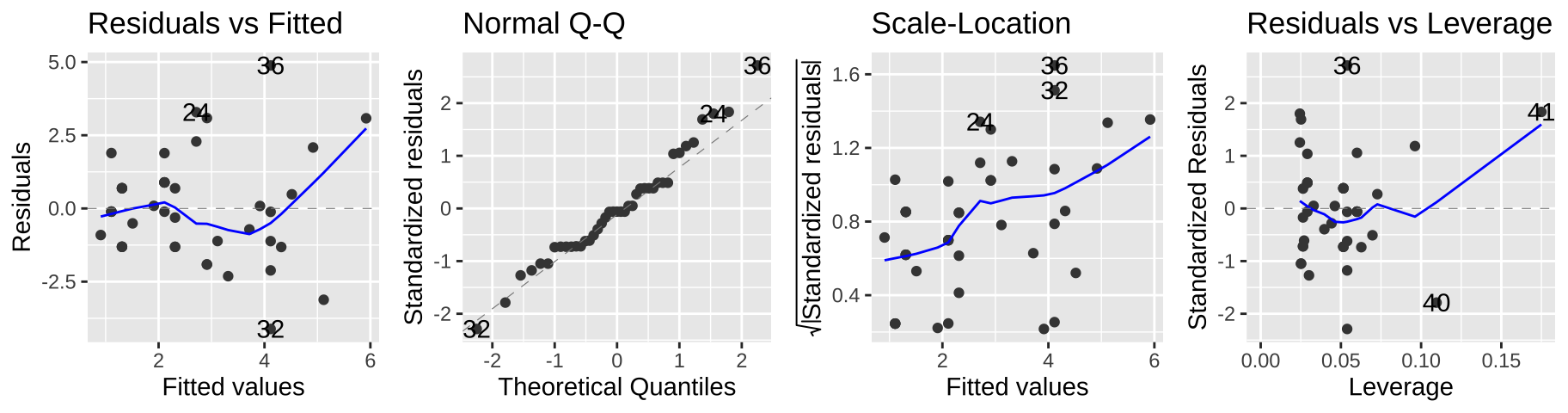 Viewing our standard diagnostic plots can help us evaluate some of these assumptions. As I said above, don’t think too hard about these y-values – think of them as a residual that would look as we hpoe if the model was a good fit.