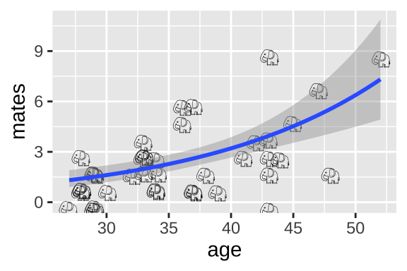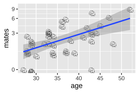 ggplot(elephants, aes(x = age, y = mates, label = emoji("elephant"))) +