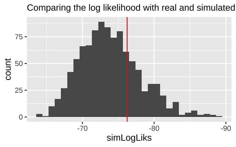 If we did a bunch of these simulations and our log likelihood way further from zero than nearly all simulated cases, we’d worry about model fit. The histogram below suggests
