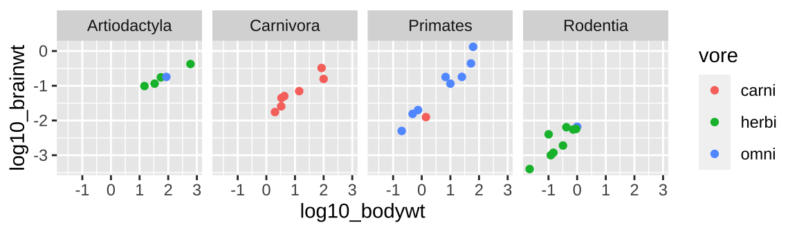 What if we wanted to see even more? Like let’s say we wanted to know if we found a similar relationship between brain weight and body weight across orders and/or if this relationship was mediated by diet. We can pack more info into these plots.