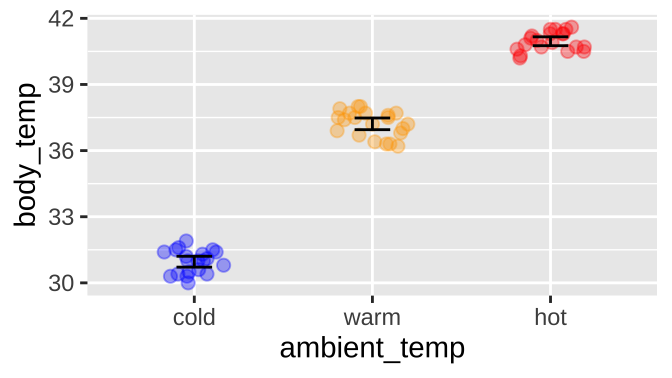 Or for the extended example in this chapter, if ambient temperature can influence body temperature in rodents, like the round-tailed ground squirrel, Spermophilus tereticaudus. In this experiment, Wooden and Walsberg (2004) put squirrels in environments that where 10°C (cold), 35°C (warm), and 45°C (hot), and measured their body temperature. The data are plotted in