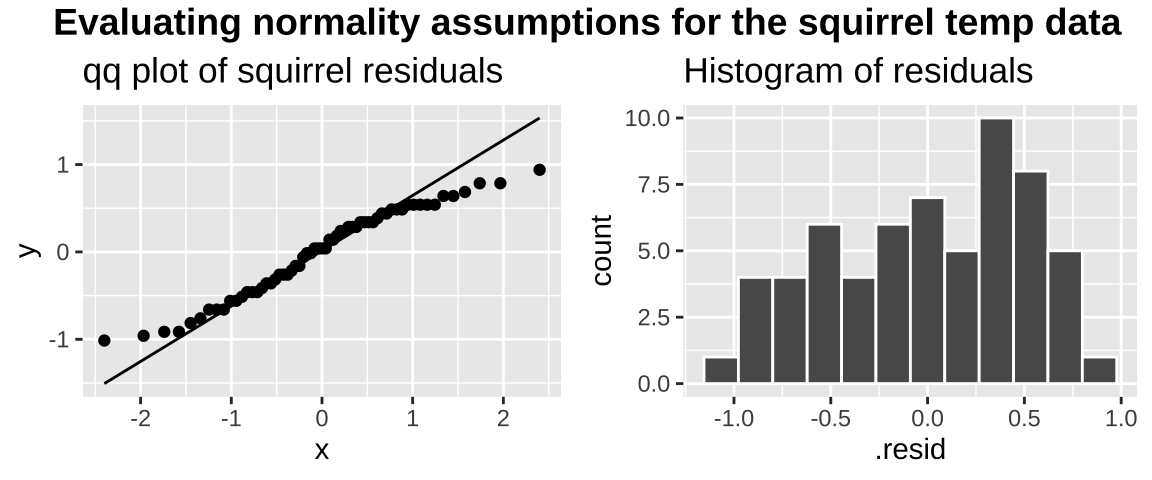 draw_label("Evaluating normality assumptions for the squirrel temp data", fontface = 'bold',x = 0,hjust = 0) +