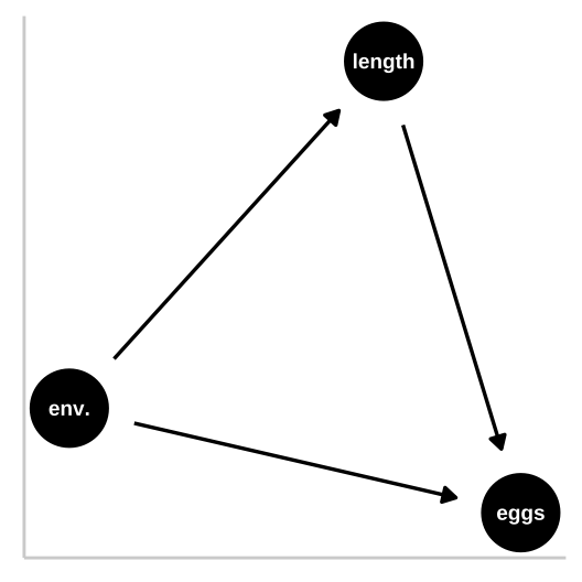 So, say we are studying a fish and want to see if being big (in length) increases fitness (measured as the number of eggs produced). To make things more interesting, let’s say that fish live environements whose quality we can measure. For the purpoes of this example, let’s say that we can reliably and correctly estimate all these values without bias, and that all have normally distributed residuals etc..