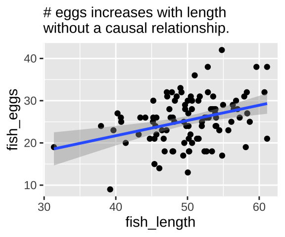 labs("Confound", subtitle = "# eggs increases with length\nwithout a causal relationship.")