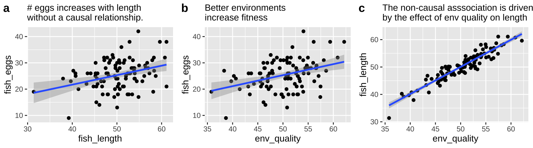 We can build a simple linear model predicting the number of fish eggs as a function of environmental quality. We can see that the prediction is good, and makes sense – egg number reliably increases with environmental quality. But we know this is not a causal relationship (because we didn’t have this cause in our simulation).