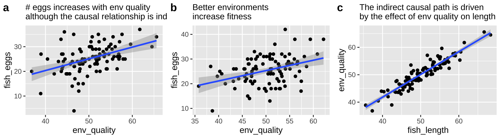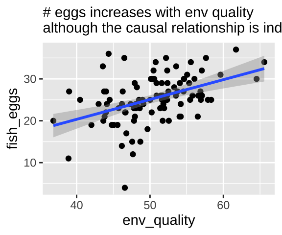labs( subtitle = "# eggs increases with env quality\nalthough the causal relationship is indirect.")