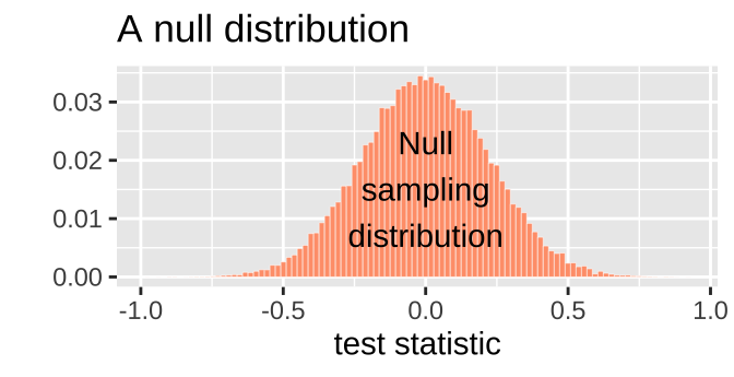 Because the null model is specific, we can generate the expected distribution of the test statistic by generating a sampling distribution from the the null model. For now, I will provide you with sampling distributions of test-statics under the null. Later we will learn more about how we can generate this distribution.